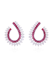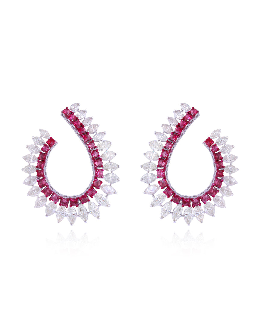 Crescent-shaped earrings with ruby and diamond spirals, designed for a bold, dramatic effect.