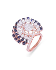 The Celestia Bloom Ring, in rose gold, features sparkling diamonds and deep blue sapphires in a stunning floral design.