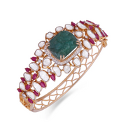 This exquisite bracelet combines a carved emerald centerpiece with radiant Polki diamonds and ruby accents. The delicate lattice goldwork highlights...